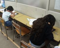 授業のはじめに、8月の課題が戻ってきたので毛筆作品を何枚かピックアップし、それぞれの良い所・ここを直したらもっと良くなる所を一人一つずつ発表してもらいました。