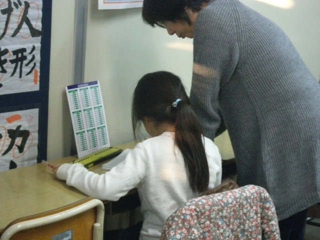 まだ、かけ算九九を習っていない年長さん、小1生たちは、九九の表を見ながらソロバンをはじいていきます。