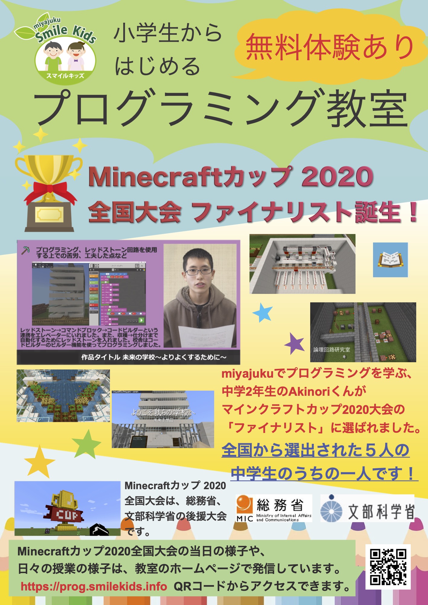 2021年度のプログラミング教室のチラシです 2021 11/27 プログラミング教室 2021年6月9日2021年11月27日 2021年度のプログラミング教室のチラシです。新規生徒募集中です! チラシのPDFファイルはこちら プログラミング教室についての説明は「プログラミング教室について」のページへ、 時間・料金については「授業日・料金について」のページをご参照ください。 プログラミング教室 プログラミング教室 よかったらシェアしてね! URLをコピーしました! URLをコピーしました! 6月3日のお稽古のようす プログラミング教室の体験会をやります! この記事を書いた人 miyajuku 関連記事 プログラミング教育とは? 2021年12月14日 10月11日の授業 2021年10月11日 8月2日の授業 2021年8月2日 プログラミング教室の体験会をやります! 2021年6月9日 Minecraftカップ2020全国大会 最終審査会・表彰式 生配信動画 2021年2月20日 Minecraftカップ全国大会2020動画配信のリンクが発表されました! 2021年2月12日 快挙! miyajukuでプログラミングを学ぶ中2生がMINECRAFTカップのファイナリストに 2021年2月5日 miyajukuの中学生の作品が、Minecraft cupの一次審査を通過しました! 2021年1月16日