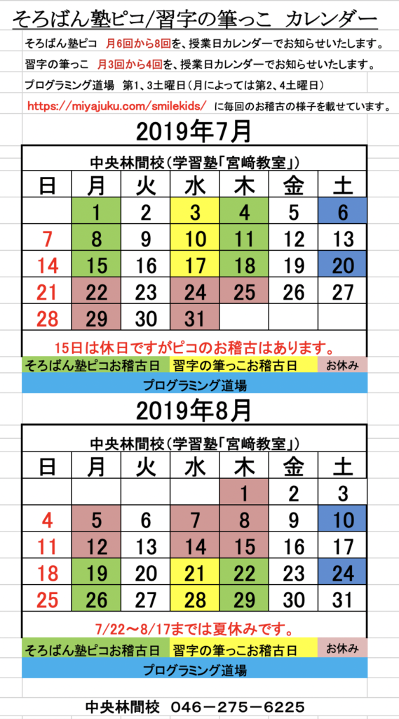 そろばん塾「ピコ」中央林間校は、7月18日までのお稽古で夏休みに入ります。新学期のお稽古は8月18日の月曜日開始です。