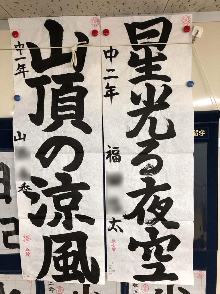 写真は、七夕競書大会のものです。Fクンは観峰賞、Yさんは金賞でした。おめでとうございます!