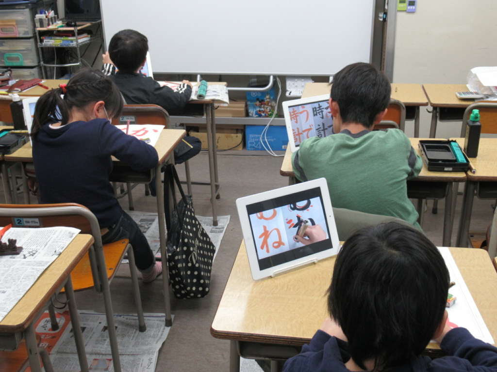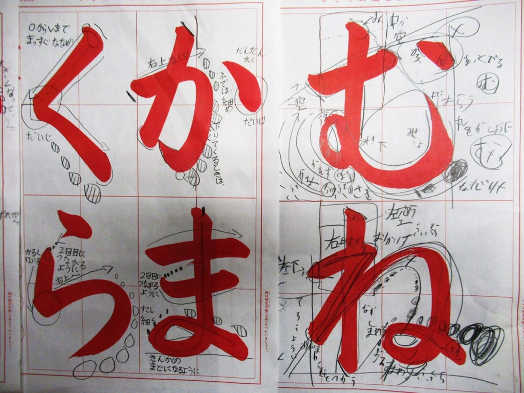 子どもたちはまず、その映像を見ながらお手本に鉛筆で注意点を書き込んでいきます。