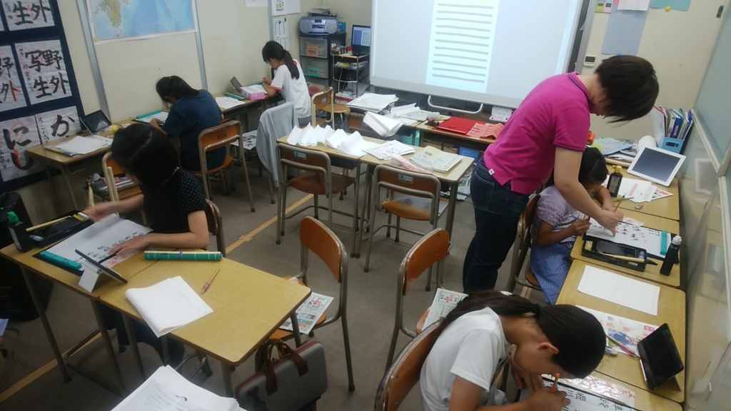 20日のお稽古は毛筆の清書日でした。 4月に比べ、だんだんと難しくなってきました。 「もうやだ~!上手く書けないよ~!」という声も聞かれましたが、皆一所懸命に一枚を仕上げました。 来月は競書大会です。大きい紙に挑戦します。 -