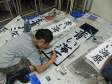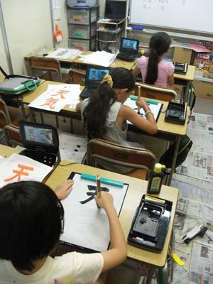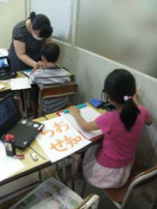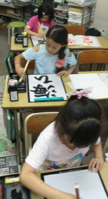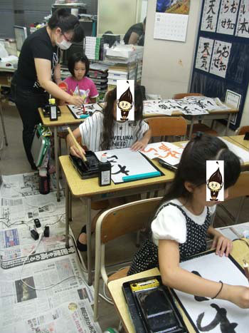 今日は「全国七夕競書大会」に出品するための作品の清書です。普段と違い、ビニールシートを教室の床に広げ、その上で大きな半紙に文字を書いていきます。みんなうまく書けたかな。習字の筆っこのお稽古は、しばらく夏休みとなります。 -