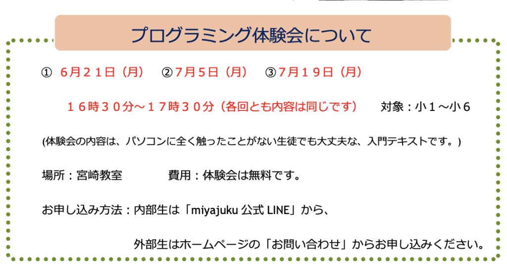 体験会は無料です。この機会に、ぜひMiyajukuプログラミング教室を体験してみてください。 体験チラシのPDFはこちら → 体験会チラシダウンロード -