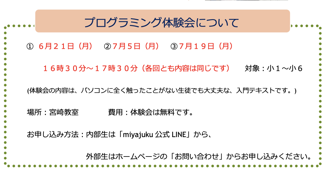 プログラミング教室の体験会をやります! 2021 11/27 プログラミング教室 2021年6月9日2021年11月27日 体験会は無料です。この機会に、ぜひMiyajukuプログラミング教室を体験してみてください。 体験チラシのPDFはこちら → 体験会チラシダウンロード プログラミング教室 プログラミング教室 よかったらシェアしてね! URLをコピーしました! URLをコピーしました! 2021年度のプログラミング教室のチラシです 習字の筆っこ6/9のお稽古 この記事を書いた人 miyajuku 関連記事 プログラミング教育とは? 2021年12月14日 10月11日の授業 2021年10月11日 8月2日の授業 2021年8月2日 2021年度のプログラミング教室のチラシです 2021年6月9日 Minecraftカップ2020全国大会 最終審査会・表彰式 生配信動画 2021年2月20日 Minecraftカップ全国大会2020動画配信のリンクが発表されました! 2021年2月12日 快挙! miyajukuでプログラミングを学ぶ中2生がMINECRAFTカップのファイナリストに 2021年2月5日 miyajukuの中学生の作品が、Minecraft cupの一次審査を通過しました! 2021年1月16日